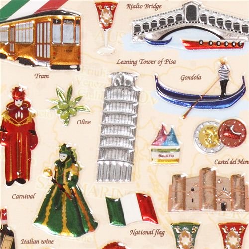 Détails techniquesautocollants rigolos avec des plats italiens, la Tour Penchée de Pise, le pont du Rialto, des gondoles, des pizzas, des pâtes, le carnaval, le Colisée, des olives, etc ...autocollants Epoxy plats, fabriqué au Japonimporté du Japon, très bonne qualité, motif mignonhauteur : 17 cm, largeur : 6,8 cmà collectionner, idéal pour la décoration & pour récompenser les bons élèves Autocollants Epoxy Italie pâtes, le pont du Rialto, gondoles?